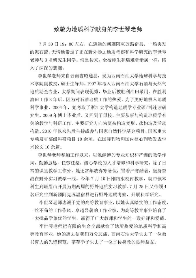 致敬为地质科学献身的李世琴老师