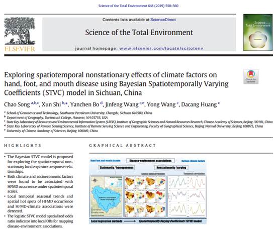 近日,我院地理信息科学专业青年教师宋超博士在国际顶级期刊《Science of the Total Environment》发表SCI论文,提出了一类新的时空局域回归统计模型(Bayesian Spatiotemporally Varying Coefficients (STVC) model),扩展了空间统计学理论和方法体系,并用于挖掘中国四川省手足口传染病的时空非平稳风险分异规律,对宏观地理空间尺度传染病防控防治具有重要应用价值。