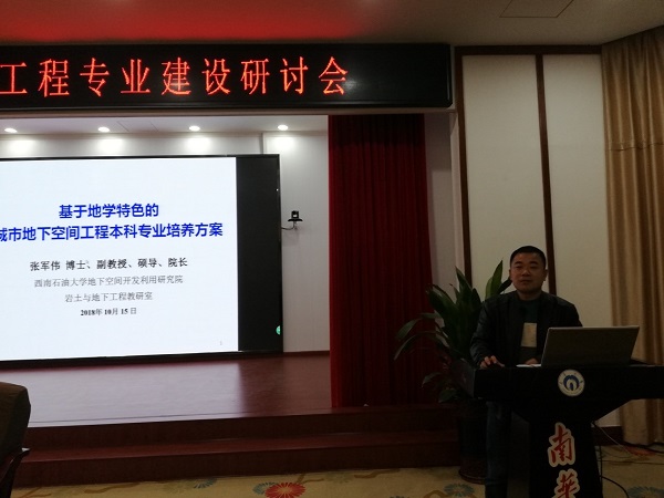 在专业建设研讨会上,与会代表围绕城市地下空间工程专业的实践教学、人才培养方案优化、专业课程建设等问题展开了广泛交流与研讨,地下空间开发利用研究院院长张军伟副教授在大会上作了的《基于地学特色的城市地下空间工程专业人才培养方案》的专题报告,介绍了我校人才培养方案的特色与特点,引起了兄弟院校的广泛关注,进一步扩大我校城市地下空间工程专业的影响力。