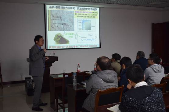 胡钦红教授以近年来全球页岩油气发展现状为切入点,对页岩油气开发涉及的纳米岩石物理科学问题展开探讨,介绍了团队在孔隙结构多尺度表征方面的研究方法和进展。胡教授在阐述页岩储层纳米岩石物理研究成果过程中,善于利用生活中的生动实例讲解晦涩的科学规律,他深入浅出、生动前沿的学术报告引发了与会师生的浓厚兴趣。