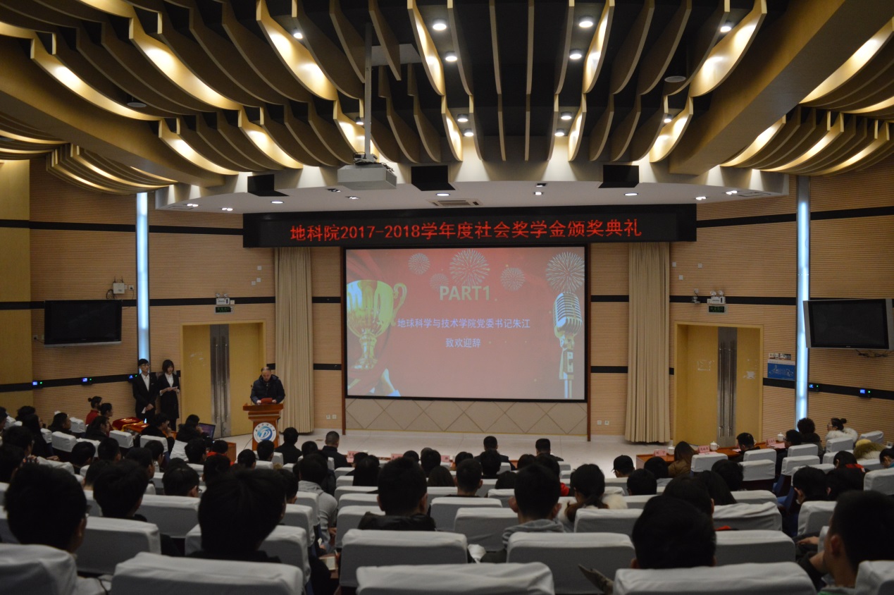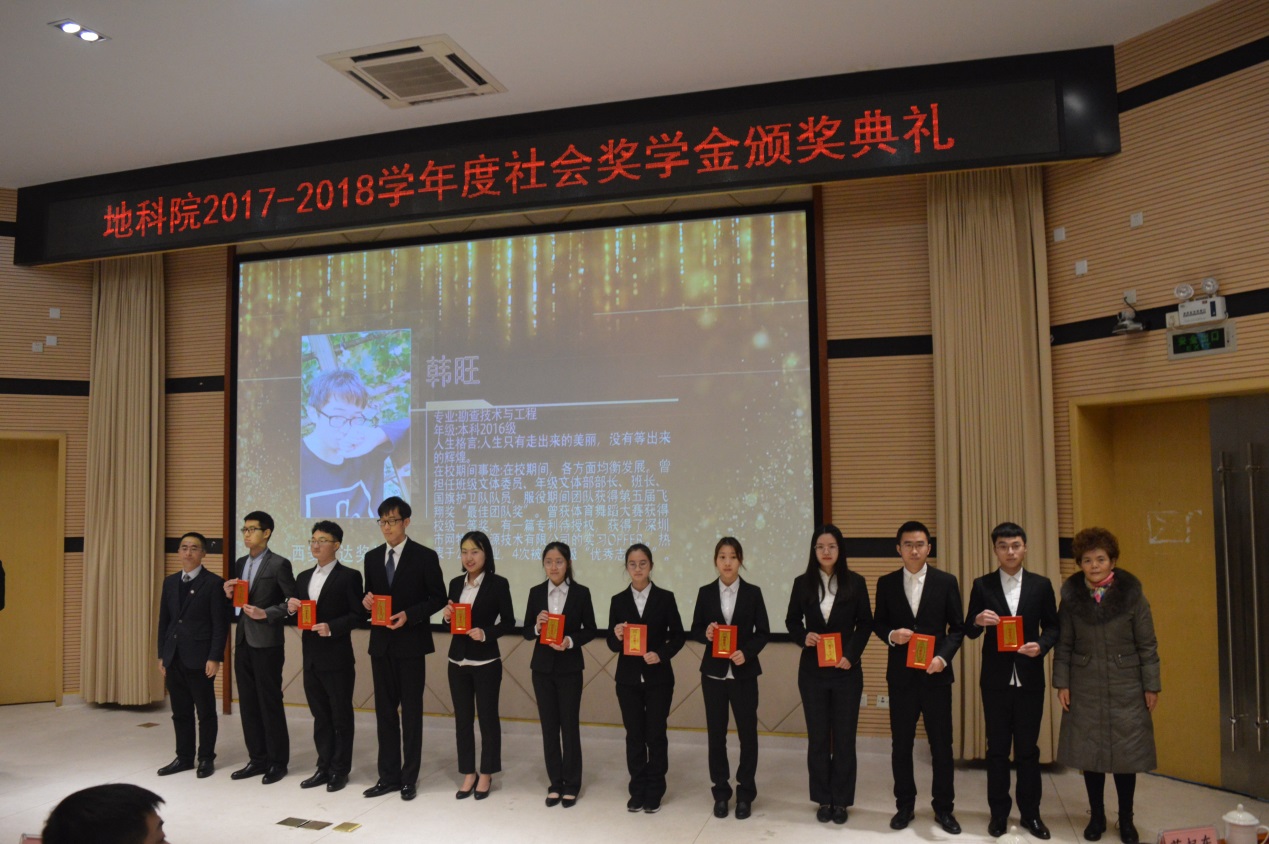 12月29日,地科院在思学楼A114隆重举行2017-2018年度社会奖学金颁奖典礼。成都中海达卫星导航技术有限公司总经理肖登宝,陕西德林能源有限公司总经理黄贤辉,西安荣达石油工程有限公司运营总监吕金芳等8名企业代表,西南石油大学学生工作部(研究生工作部)副部长张浩,西南石油大学招生就业处副处长肖友平,地球科学与技术学院党委记朱江,地球科学与技术学院党委副书记范起东出席本次会议。