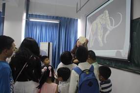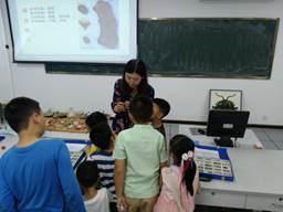 之后,小朋友们跟随讲解员来到了实验中心古生物实验室,在这里看到了“遥远的生物”展览,讲解员为小朋友们古生物和化石的概念并介绍了化石形成的过程、条件及制作化石的方法。之后,介绍了原生动物门、腔肠动物门、软体动物门、节肢动物门、腕足动物门等不同门类的古生物的特征及时代。着重引领小朋友观察了不同门类的化石代表,面对琳琅满目、形状各异的漂亮化石:蜂窝状、拖鞋状、链状的珊瑚,蝙蝠状、王冠状的三叶虫,螺旋形状如鹦鹉嘴状的鹦鹉螺,缝合线如菊花状的菊石……小朋友们表现出了极大地兴趣和关注,纷纷走上讲台观察、询问和互动。