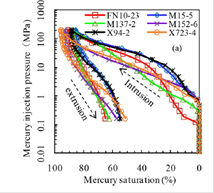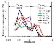 针对跨尺度纳米——微米级孔隙的非常规储层,高压压汞具有探测纳米级(>3.6nm)孔喉的优点,得到孔喉半径及分布。但是,该方法受到“pore-blocking”的影响,对大孔喉的反映造成影响。相比于高压压汞,恒速压汞具有可以区分孔隙、喉道并分别计算得到孔隙、喉道分布的优点;但是,受有限压力的限制(<6.2Mpa),该方法难以反映纳米级(<0.12um)的孔喉;同时,岩心铸体薄片显示,恒速压汞得到的孔隙半径偏大,与实际不符。鉴于此,充分利用高压压汞与恒速压汞的优点,得到了反映岩石纳米——微米级跨尺度喉道分布特征。