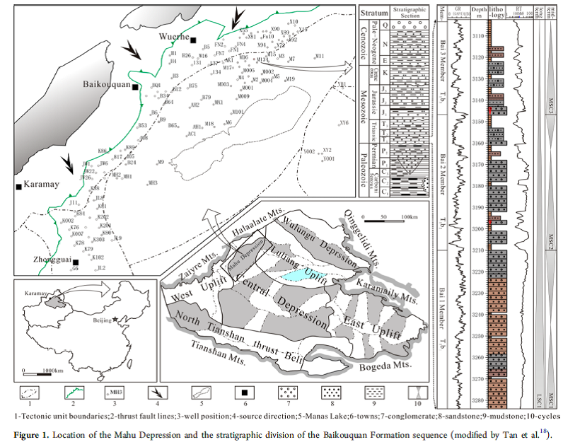 该论文以玛湖凹陷三叠系百口泉组致密砂砾岩为研究对象(图2),针对孔隙结构表征方法(高压压汞、恒速压汞、核磁共振等)普遍存在的缺点,提出了表征致密储层孔隙结构(孔隙分布、喉道分布、孔喉分布等)及分类的新方法与新标准(图3与图4)。进一步,论文探讨了孔隙结构对储层物性及渗流的控制机理。研究成果对致密储层的表征、非常规油气的勘探开发具有重要实用价值及学术意义。