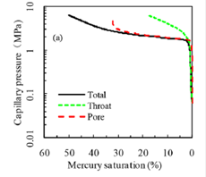 核磁共振测量岩石孔隙系统中流体(水、油气)的氢原子;在以表面驰豫为主的情况下,核磁T2谱为岩石孔隙、喉道的综合响应;该方法表征范围较广,即可以表征纳米—微米级的孔隙系统,但是难以区分孔隙与喉道。为此,利用高压压汞与恒速压汞得到的纳米级喉道刻度核磁T2谱短驰豫时间,获得了核磁T2谱中喉道的响应;进一步,明确了核磁T2谱中孔隙的响应并计算得到了孔隙分布。