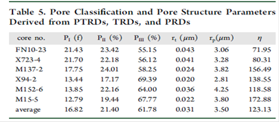 论文在孔隙结构表征的基础上,针对IUPAC(国际理论和应用化学联合会)以及Loucks等人对致密储层分类的局限性,提出了新的分类标准:孔隙类型I(孔喉半径大于1um)、孔隙类型II(孔喉半径0.1—1um)、孔隙类型III(孔喉半径小于0.1um)(表1)。进一步,探讨了孔隙结构对储层物性及渗流的控制机理。