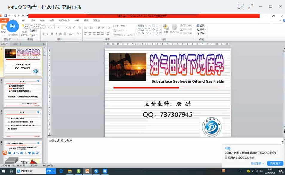 《油气藏开发地质学》课程团队采用QQ群直播方式进行,2月24日已经完成试播。学生反映图像和声音都清楚,效果良好。