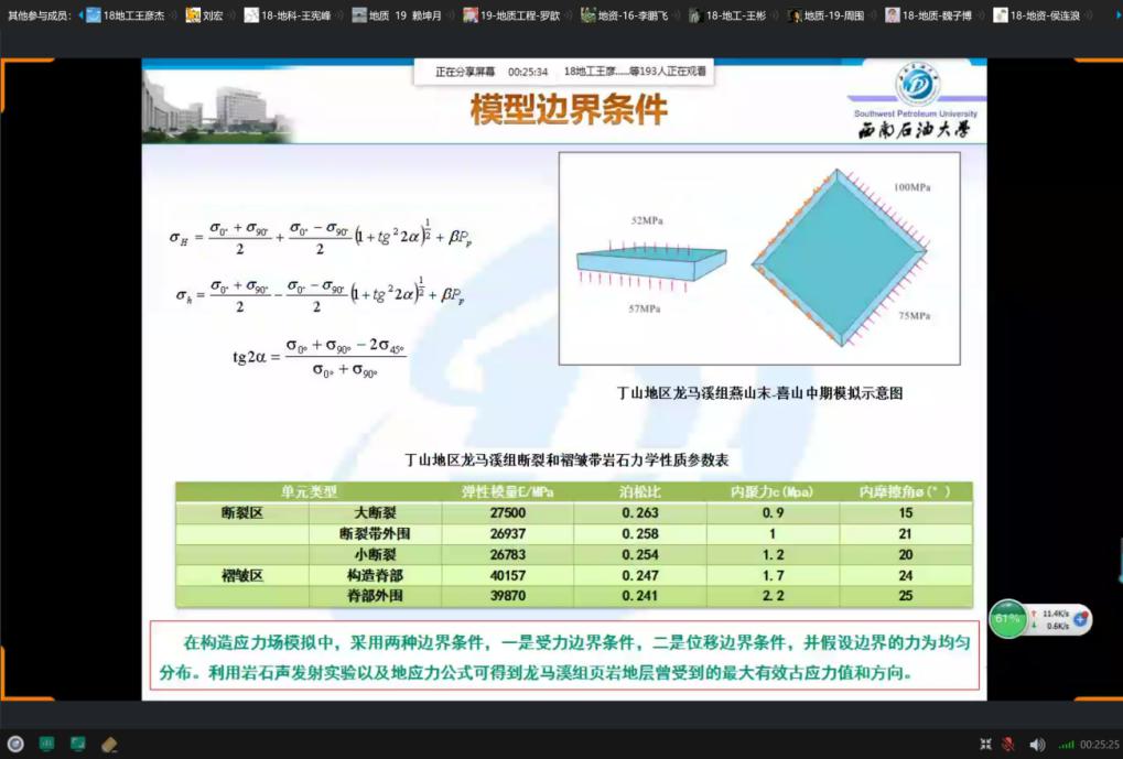 线上学术报告不仅是一场特殊的学术交流,更是一次线上创新教学的新奇体验。2月28日,第一期线上博士论坛的主讲人分别是17级博士李虎和谢佳彤同学。讲座中,李虎博士以川东北YB地区为例,详细地讲解了“挤压性盆地高角度断裂成因及形成模式”,他的耐心讲解得到了同学们的高度肯定。与李虎博士的知识讲解方式不同,谢佳彤博士通过共享屏幕实际操作软件,为同学们演示了裂缝预测模拟技术和讲解有限元软件的软件应用。3月5日,第二期线上论坛如约而至。主讲人分别是17级博士谷一凡和石文睿同学。谷一凡博士以龙岗东地区为例,详细地讲解了“晚二叠世环开江-梁平海槽沉积格局再认识”。石文睿博士通过中英文结合的方式,为同学们讲解了“涪陵地区页岩气用水的发展情况”。每期线上报告大约持续一个半小时,整个过程秩序良好,汇报画面和语音清晰。报告结束后论坛主讲人还耐心一一解答同学们提出的问题。同学们纷纷表示“线上讲座的效果原来也能如此受益匪浅,非常感谢博士们的学术经验分享”。