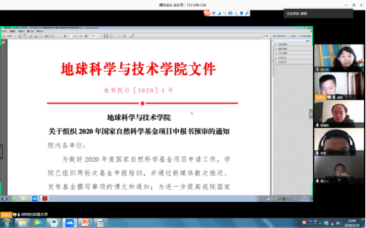 在近1小时的会议中,胡明主任带领大家共同学习了“关于2020年春季学期本科生继续实施在线教学的通知”、“地球科学与技术学院关于组织2020年国家自然科学基金项目申报书预审的通知”、“关于做好疫情防控期间保密管理提醒工作的通知”等相关文件。同时,对2019年教研室取得的成绩进行了全面总结,对每位老师的贡献给予了充分的肯定,对面对疫情,全校师生及校友们踊跃捐款捐物,教研室老师们积极准备课程在线教学的行为,朱贝、王浩铮等青年教师组织并参与的“青年教师科普与学术系列活动”,给予了高度赞扬,并号召年轻老师积极加入到系列活动中去。