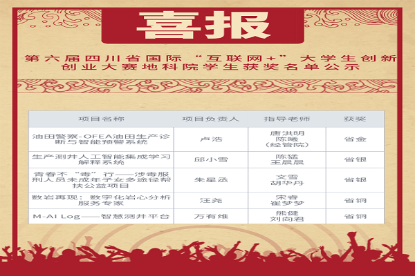 7月6日,西南石油大学第六届“互联网+”大学生创新创业大赛在云端拉开帷幕。进入校赛的项目经过自主申报、专家在线初审和校赛终审,我院的队伍在校赛中获2项金奖、4项银奖和14项铜奖。经过校赛的选拔,7月31日,我院5支队伍代表学校参加四川省第六届“互联网+”大学生创新创业大赛,获得省金奖1项、银奖2项、铜奖2项。