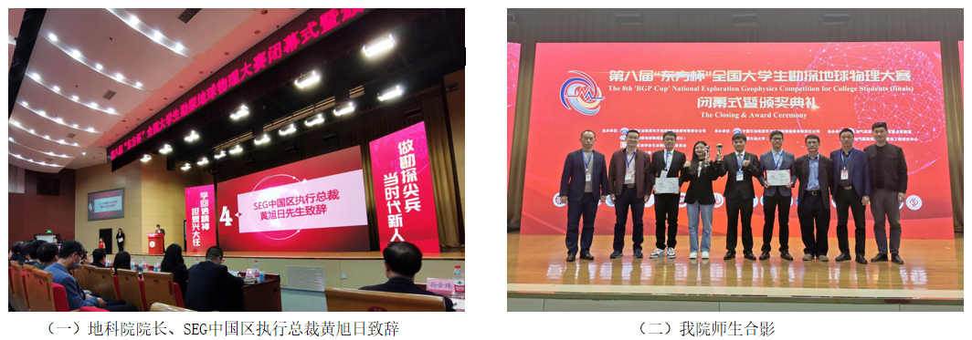 11月3日下午,第八届“东方杯”全国大学生勘探地球物理大赛闭幕式暨颁奖典礼在中国石油大学中油大厦举行,地科院院长、SEG中国区执行总裁黄旭日及部分教师代表出席了本次闭幕式。我院黎孟承、周觅路同学的“Go for it”团队斩获最高荣誉—特等奖(全国唯一),为我院参赛以来最好成绩;另外,邱泽华、王琳同学的“勘探进取队”团队获一等奖(排名第一),教师刘文革和刘福烈获优秀指导老师奖;因在大赛期间的突出贡献,我校荣获第八届“东方杯”优秀组织奖。我院两支获奖队伍还将前往河北涿州东方地球物理公司进行参观学习,近距离感受企业文化。