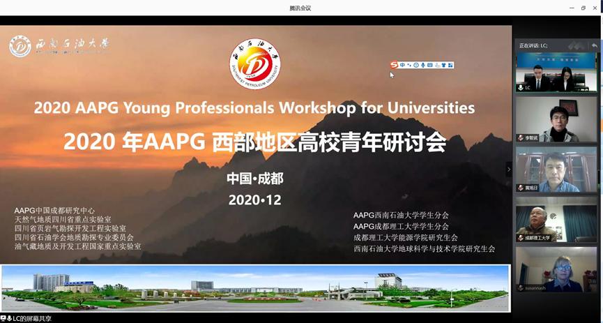 2020年12月19日至20日,由我校承办的首届AAPG西部地区高校青年研讨会顺利召开。本次会议由西南石油大学与成都理工大学联合发起,在AAPG总部、AAPG成都研究中心及四川省石油学会地质勘探专业委员会的大力支持下,依托我校天然气地质四川省重点实验室和成都理工大学页岩气勘探开发四川省工程实验室,联合西安石油大学、西南科技大学、重庆科技学院等共同举办了此次青年学术研讨盛会。由于近期疫情防控需要,此次会议全程在线上举办。