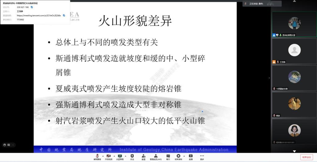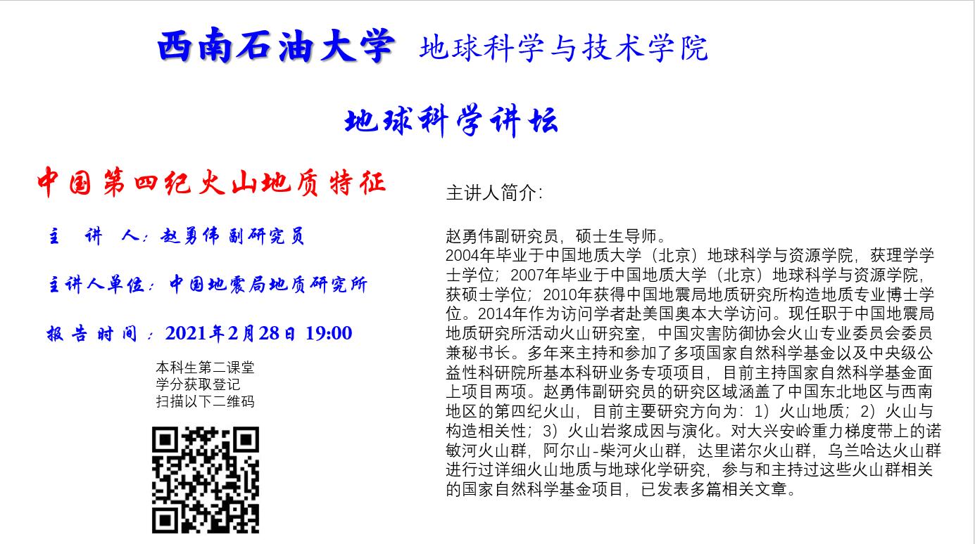 2021年2月28日19:00,由地科院发起的地球科学讲坛新学期第一讲,邀请到了中国地震局地质研究所活动火山研究室、中国灾害防御协会火山专业委员会委员兼秘书长赵勇伟副研究员为全校师生在线带来了精彩报告“中国第四纪火山地质特征”。赵老师用深入浅出的语言与精美的野外照片向大家讲解并展示了我国典型的第四纪火山的地质特点,并介绍影响单成因火山喷发类型与最终形貌的可能因素,提高大家对我国第四纪数百座火山活动规律的认识。报告结束时,同学们勇跃发言,从火山形成的机理、火山喷发与气候的关系,火山喷发的预测与监测,火山研究的展望等多方面与赵老师进行了深入地交流。同学们纷纷表示从报告中感受到了地球科学的魅力。