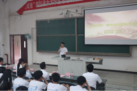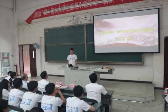 在激昂的《国际歌》歌声中,大会正式开幕。李明科老师带领所有党员同志在党旗下郑重举起右手,共同重温入党誓词,用铿锵有力的声音表达了对党的无限忠诚以及为共产主义奋斗终生的理想和信念。随后,毕业生党员代表进行发言。本科生代表安金彪和研究生代表蒋华川发言中均表达了自己对党、对母校、对老师和同学深深的感谢之情,并表示今后踏入社会定会牢记自己的党员身份,强化自身党员责任意识,为党和国家的建设与发展贡献力量,为母校增光添彩。