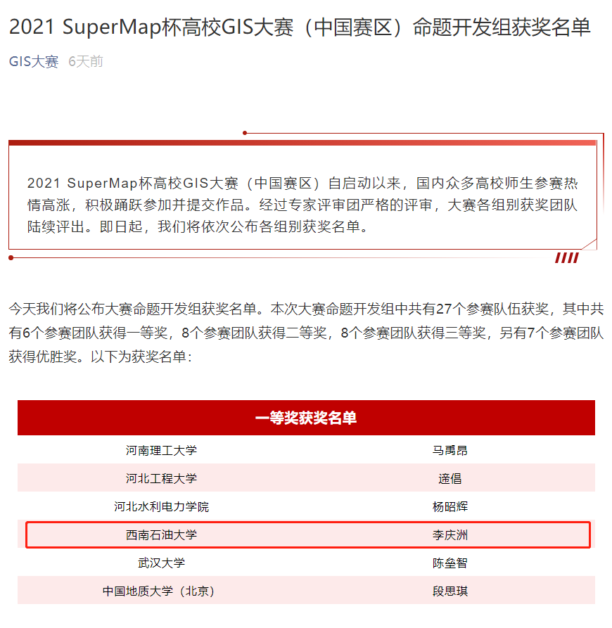 近日,由中国测绘学会主办“易智瑞杯中国大学生GIS软件开发竞赛”,中国地理学会、中国地理信息产业协会主办的“SuperMap杯高校GIS大赛”,全国高等学校测绘类专业竞赛联盟和自然资源部职业技能鉴定指导中心主办的“华测导航杯”全国大学生测绘创新开发大赛落下帷幕,我院地信教研室再次取得优异成绩,共获得一等奖3项,二等奖1项,三等奖2项,优胜奖2项。