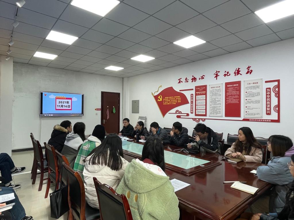 2021年12月16日,地科院岩土科研团队党支部在明辨楼A302组织学习党的十九届六中全会审议通过的《中共中央关于党的百年奋斗重大成就和历史经验的决议》(以下简称《决议》),并召开预备党员转正大会,讨论关于陈昱霏、黄梦婷和王慧3位同志的预备党员转正问题。支部全体党员同志出席了本次大会。