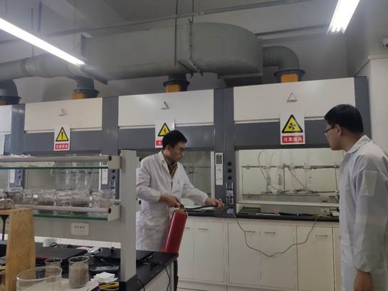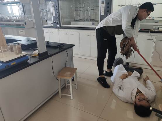 安全演练的科目以目前课题组正在做的抽提实验为基础展开,分别设计了三氯甲烷误入眼睛、三氯甲烷遗失、操作人员触电以及通风橱失火等四种情况。在演练的过程中,同学们相互配合,熟悉了化学试剂的特性、保存方式及接触人体后的急救方法,并对如何正确使用电器和灭火器进行了示范。此外,在相关老师的指导下,同学们加强了对校医院、校保卫科等部门报警电话的记忆,模拟了不同类型安全事故发生时的处理流程,为安全事故发生后的规范处理提供了参考。