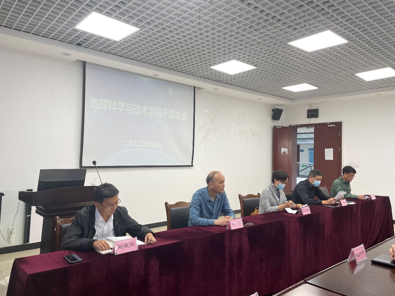 5月5日上午,地球科学与技术学院在明辨楼D404召开干部大会,学校党委常委、副校长刘向君,学校党委常委、组织部长侯忠建,地科院领导班子成员以及各科级干部、党支部书记、教研室主任、实验室主任、教授代表等出席本次会议,学院院长黄旭日主持本次会议。