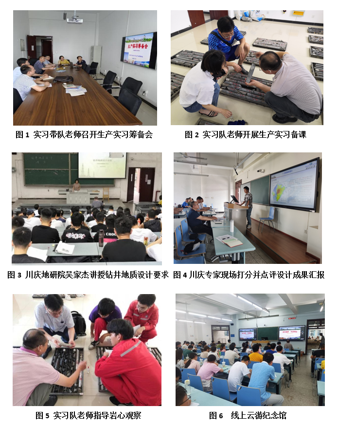 实习过程中,学院邀请了川西北气矿的熊安璐、罗静和王旭丽3位专家通过在线讲座向同学们讲解了中国石油的HSE管理理念、油气藏开发过程中的动态地质分析以及川西北气矿的研究现状等,全方面、多维度地展示了油田工作者的工作内容。校内老师安先彬在学校实习实训基地就钻井、地质录井及油气的开采、集输过程等方面给同学们做了详细的介绍。为加强工程设计能力的培养,本次生产实习特别新增了钻井地质设计环节,邀请到川庆钻探公司“吴家杰巾帼创新工作室”负责人吴家杰(钻井地质设计专家)到校给同学们讲授一天的钻井地质设计的要求、设计内容和方法。同学们根据现场资料,应用课程所学知识,通过小组合作开展4天的钻井地质设计,最后以PPT形式进行了成果汇报。川庆地研院尹平、吴家杰两位专家结合自身工作实例进行了现场点评并给大家提出了合理建议,极大地激发了同学们的学习热情。随后,实习队老师对本次生产实习的重点内容——岩心和岩屑观察描述展开了教学,通过分组观察描述并分别绘制岩心、岩屑录井图,切实做到了理论联系实际,增强了同学们的动手能力。在初步了解川西北气矿的勘探开发现状的基础上,为了让同学们更好地了解四川盆地的油气勘探开发历程,实习队特别精心组织同学们线上云游四川石油会战史馆、红村石油会战旧址、毛主席视察隆昌气矿纪念馆,使同学们对四川油气60余载的勘探开发历程、3次史诗般油气会战和取得的伟大成就有了清晰的认识,深深地被“艰苦奋斗、求实创新”的川油精神所感动,进一步坚定了同学们继承石油精神,兴油报国的理想信念。