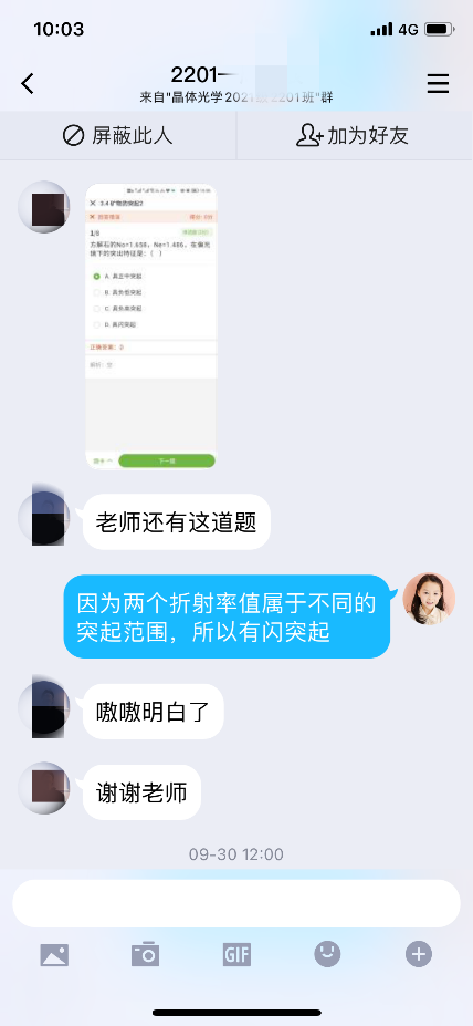 对于教师,可以通过慕课堂学情分析了解每位同学课堂表现及答题分布情况。学生也可以通过QQ群聊天、留言等方式向老师提问(图6)。