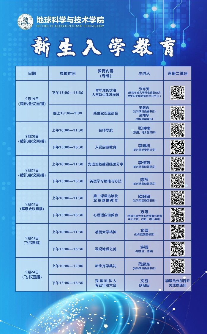 9月29日14:30,西南石油大学地球科学与技术学院2022级新生开学典礼在线上举行。学院院长黄旭日,学院党委副书记(主持工作)赵晓明,学院党委副书记、纪委书记范起东,学院副院长范翔宇,学院副院长刘宏,优秀教师代表韦恒叶及相关老师出席本次会议,全体专业建设负责人、教研室主任、2022级学业导师、辅导员老师、全体2022级新生参加了此次开学典礼,典礼由团委副书记、新生辅导员欧阳田老师主持。