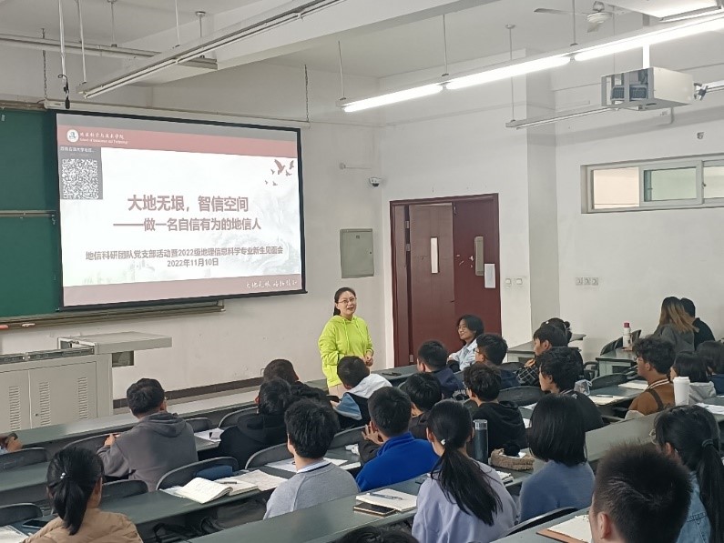 在学院党委的领导下,地信科研团队党支部成立之初就确定了“党建促进科研、党建引领育人”的支部建设模式。为了让2022级地理信息科学专业的同学们全面了解地理信息科学专业,尽快建立专业认同感,11月10日下午,地信科研团队党支部以“大地无垠,智信空间——做一名自信有为的地信人”为题,为地理信息科学专业2022级新生作了一场别开生面的专业宣讲会。宣讲会由党支部书记王成武主持。地信科研团队党支部全体党员参加了此次活动。