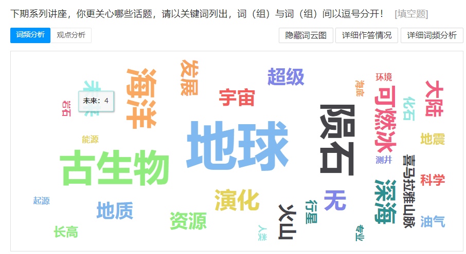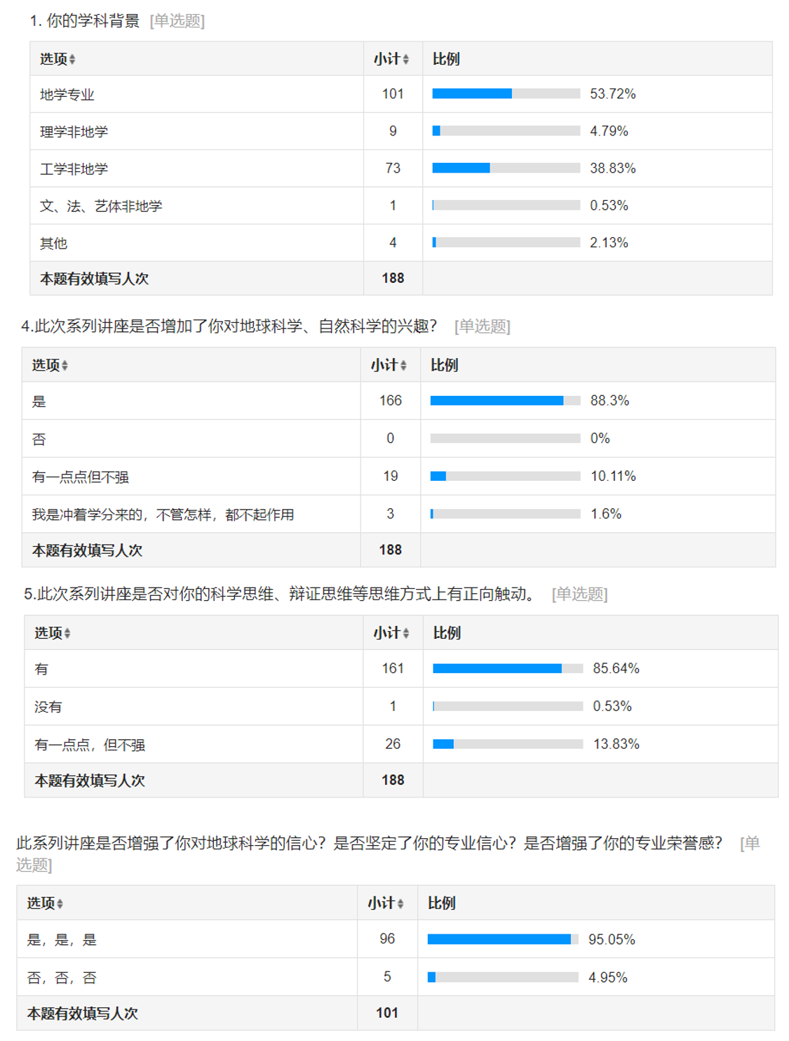 该系列讲座完成后,课程组织方迅速就讲座效果进行了调研评估。一位同学在调查问卷中反馈到:“这次讲座中,我最大的收获是在讲座中认真地学会了思考一个科学问题,而且得到了主讲人积极的回应,这让我对自己的专业更加充满信心。”据了解,截止发稿前,课程组织方共回收188份有效调研问卷,调研结果反映,此次系列讲座的听众近一半为地学专业的同学,其中95%的听众认为系列讲座帮助他们加深了专业认识、坚定了专业信心、增强了专业荣誉感;同时,这188份问卷中,85%以上的同学反映该系列讲座对于自己的科学思维均有正向的触动。