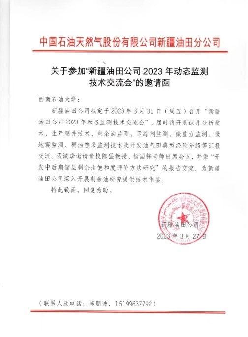 2023年3月31日,新疆油田公司在克拉玛依召开“新疆油田公司2023年动态监测技术交流会”,我院测井教研室教师陈猛和杨国锋受邀参加。会上,陈猛副研究员作了题为“开发中后期储层剩余油饱和度评价方法研究”的主题报告,报告结合新疆油田开发实际,介绍了我院“生产测井与油气藏生产动态评价”团队近年来在套后储层剩余油饱和度监测与评价方面的研究进展及生产测井方向代表性研究成果,并与参会专家展开了广泛交流讨论。