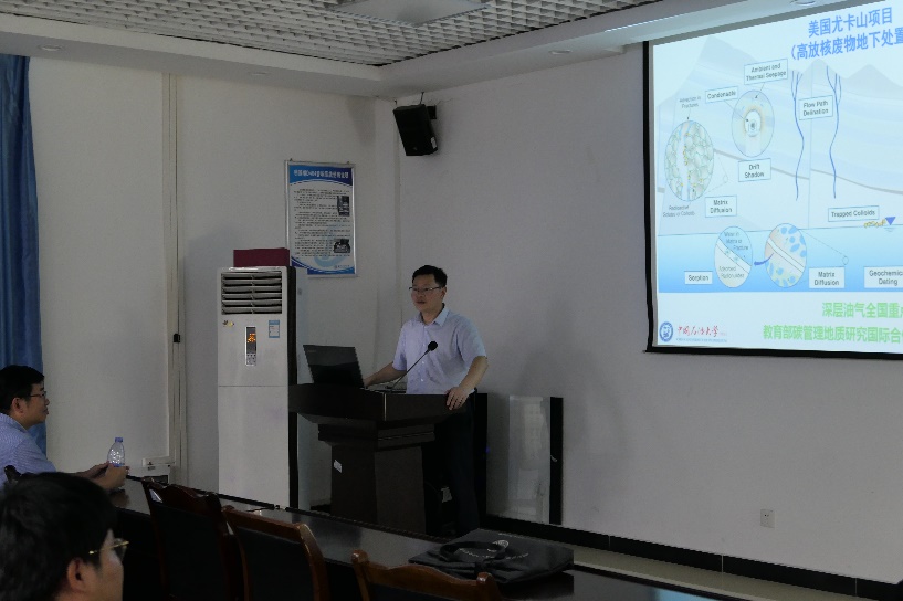范翔宇隆重介绍了胡教授,并代表全院师生对胡教授的莅临表示热烈的欢迎。胡教授从页岩油气高效开采、绿氢地质储存、高放核废物地质处置等多个领域入手,并基于美国核废物地质处置项目及中美页岩油气开采工作,围绕低渗介质和裂缝双重体系的影响,从基质纳米孔隙连通性与基质-裂缝相互作用出发,应用自主开发的互补性纳米岩石物理等研究方法,为大家深入的讲解了其中关于理论与手段的创新性等内容。此外,还特别强调了环境与能源的历史进程,从而引出地下存储系统,并介绍了中石化汉江岩穴储气库的运作模式。胡教授讲授的内容引起了大家的共鸣,大家进行了深入的交流。