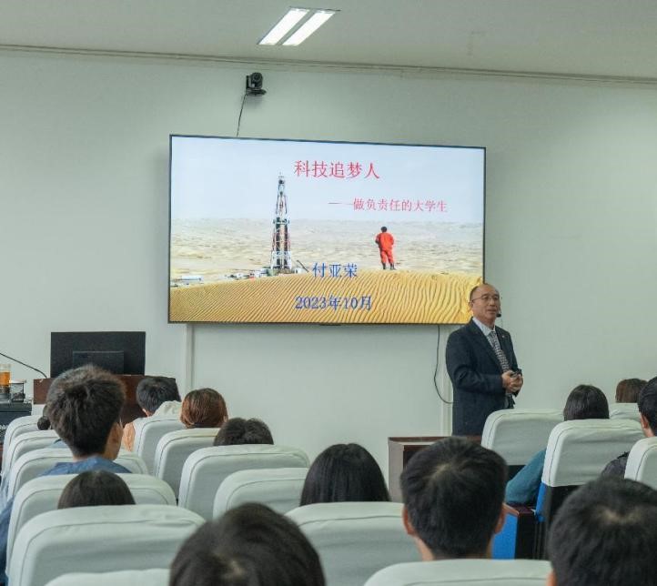 10月12日上午,全国科技创新排头兵,中国石油天然气股份有限公司的教授级高级工程师付亚荣受邀为我校学生作了一场题为“科技追梦人——做负责任的大学生”的专题讲座,讲座由地科院副院长范翔宇教授主持。