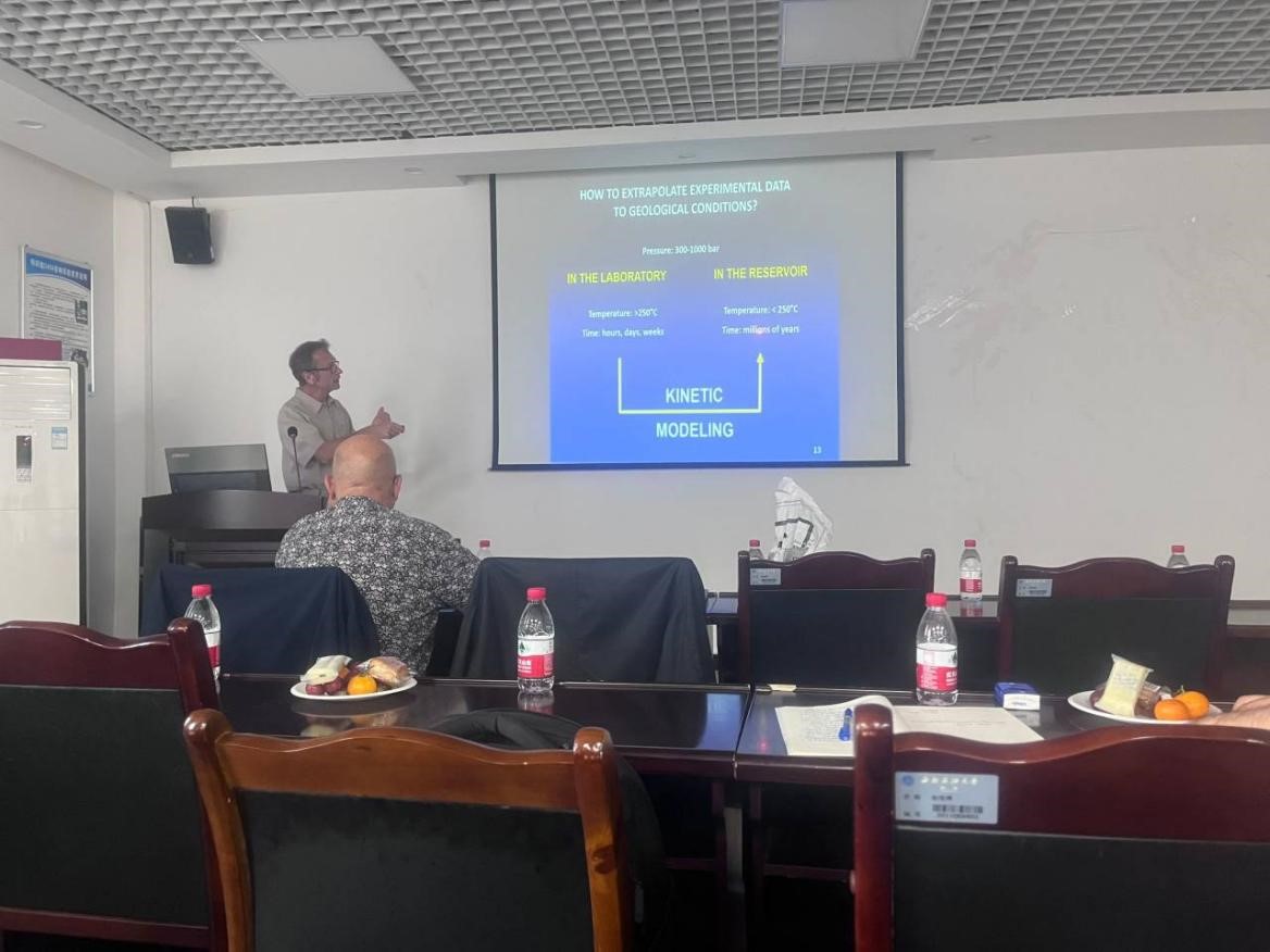 学术交流沿生排烃-油气充注-油气成藏的脉络展开。Raymond Michels教授基于烃源岩在人工加热和组分演化的实验研究,就封闭系统和高压含水热解实验中水和压力对原油生成的影响、不同温度下压力对烷烃裂解的影响、H2S对高温高压下烷基苯热裂解的影响等,深刻讲解高温高压对碳氢化合物生成和热稳定性的影响,让师生更了解烃源岩生排烃过程的知识。Jacques Pironon教授从如何识别硅质碎屑岩和碳酸盐岩储层岩石样品中的流体包裹体、如何用显微测温法观察到的相变过程、如何获得包裹体中小体积流体的成分估计、如何重建流体捕获的PT条件等几个重要方面出发,依靠双等容线技术恢复石油捕获压力与温度以及红外光谱定量分析石油包裹体组分等方法的应用,为大家深入讲解了应用于含油气盆地油气成藏的流体包裹体研究。鲁雪松主任以川中震旦系为例,将深层古老碳酸盐岩面临的勘探和技术需求、深层古老碳酸盐岩成藏历史恢复关键技术作为重点,展示了川中震旦系成岩-成藏历史重建与勘探启示,使师生们对石油地质综合研究与成藏评价有了更深刻的理解。三位专家讲授的内容引起了大家的共鸣,并进行了深入的交流。