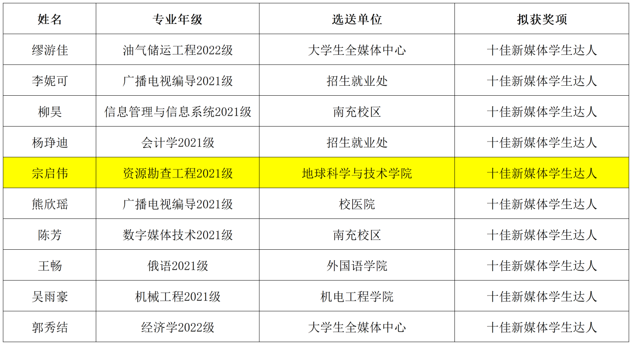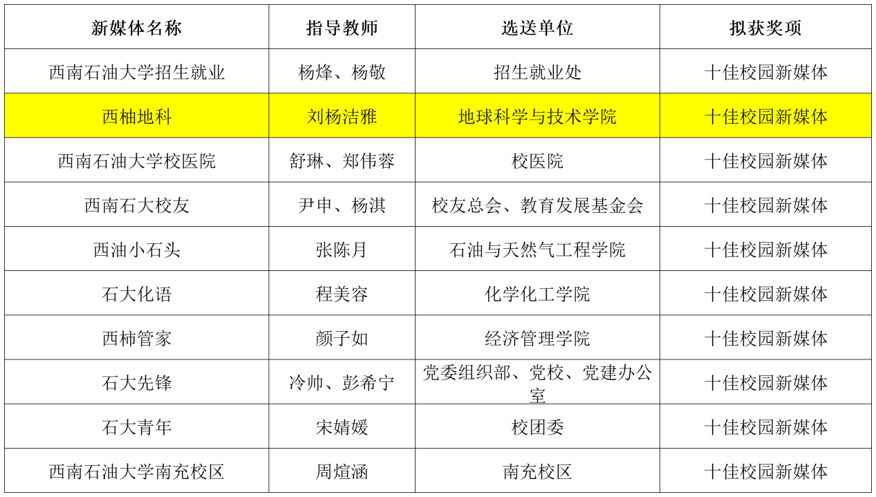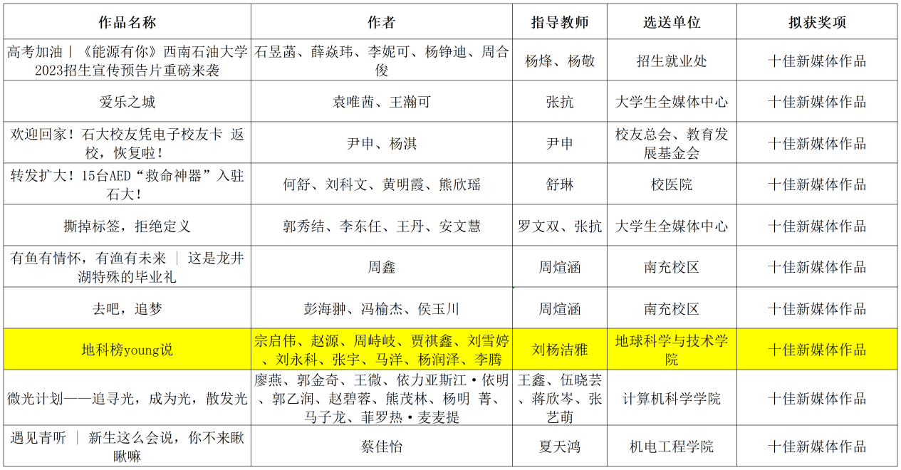 我院刘杨洁雅老师指导融媒体中心运营的“西柚地科”成功入选2023年十佳校园新媒体。学院微信公众号特色栏目《地科榜young说》系列入选2023年十佳新媒体作品,融媒体中心现任分管主席宗启伟荣获十佳新媒体学生达人,实现了十佳校园媒体的“大满贯”。