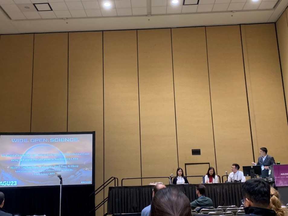我院张廷山教授课题组李世鑫博士生在会议专题PP53A(中生代-古新世高温事件期间的气候变化和极端环境),作了题为“The Record of Sedimentary and Ecosystems Responds to Hyperthermal Event during the Carnian Pluvial Episode in Southwestern China”口头汇报,介绍了晚三叠世极端气候环境下我国华南地区碳酸盐岩台地沉积演化过程及生态响应,并与参会专家进行了广泛的研讨交流,为国内外专家理解全球晚三叠世极端气候事件过程和环境-生物协同演化关系提供了重要参考,进一步为加强我校国际学术交流与合作以及扩大学术影响力起到了良好的助推作用。