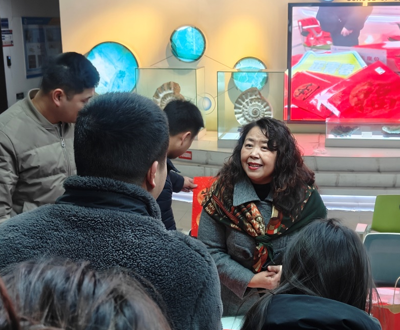 衡书记一行在明辨楼A区岩石展厅,遇到学院正在开展“祥龙献瑞,春联送福”活动,参与到同学们的活动之中。看到一幅幅学生自己构思、自己书写的春联,衡书记拿出手机拍照留作纪念,并表示:“同学们写的春联很好,不仅字写的好看,而且内容各有特色,有的与学科特色相关,有的表达了对来年科研成果的期许,很不错”。衡书记非常关心学生,询问他们留校学习生活有没有什么困难、家是什么地方的、什么时候返乡回家,预祝同学们新春快乐、心想事成。看到衡书记如此和蔼可亲,同学们话匣子都打开了,畅聊留校期间学习生活的事情,同学们还请衡书记指导自己书写“福”字,场面十分温馨,衡书记一行与同学们合影留念,为地科院师生送去祝福。地质学2022级硕士研究生袁满说到:学院有这样温暖的活动,学校领导还在假期来看望我们,为我们送上新春祝福,真的太幸福了。