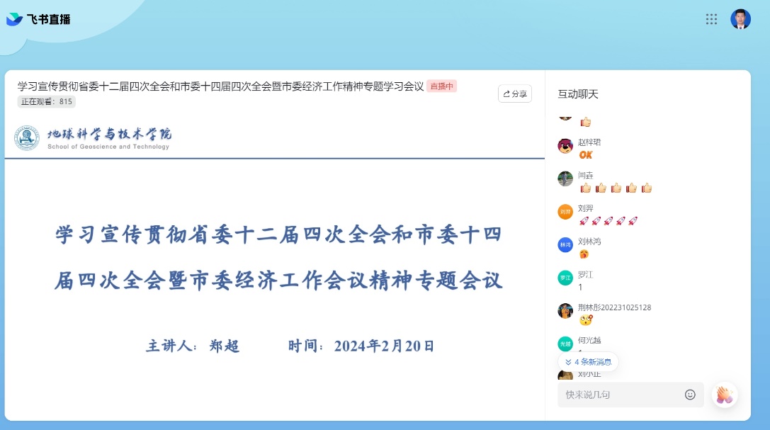 2月20日,地科院团委组织召开线上专题会,学习贯彻省委十二届四次全会和市委十四届四次全会暨市委经济工作会议精神,学院党委副书记张勇、团委书记文雪、团委副书记王晨晨以及1900余名学生参加会议。