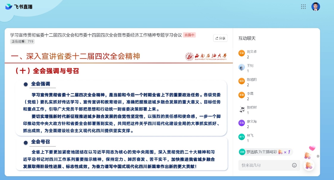 首先由文雪传达省委十二届四次全会会议精神,省委十二届四次全会是深入贯彻党的二十大精神和习近平总书记来川视察重要指示精神、中央经济工作会议的一次十分重要的会议,系统回答了新时代新征程四川城乡融合发展之路应当“如何走”“怎么干”等重大问题,准确掌握了四川现代化建设的关键所在。倡导广大青年学子深入领会会议精神,切实把思想和行动统一到省委、市委决策部署上来,不断提升自身综合实力,服务社会。
