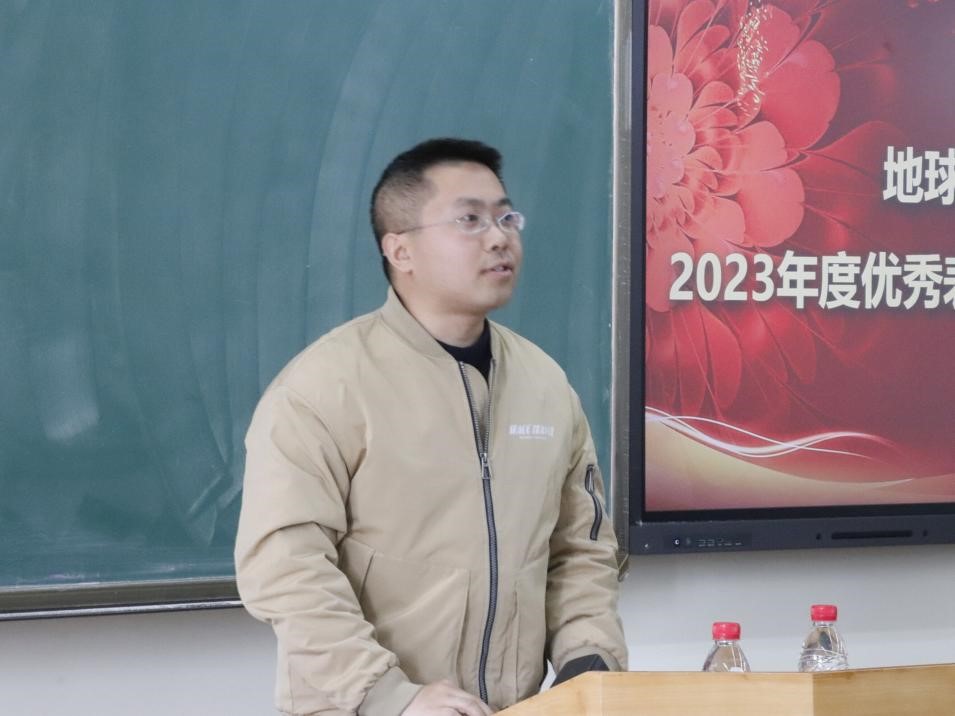 基础地质教研室周翊老师作为青年教师获奖代表发言。周翊向各级领导对青年教师的关怀与真诚帮助,使青年教师能够迅速发展、有所作为表示感谢。他提出青年教师应当提升科研能力、积极准备竞赛、推动教研教改工作,并且要不断合作、请教、反思,争做四有好老师,做一名精于传道授业的好教师。周翊鼓舞广大教师满怀教学热爱与科研激情,助力地科院的发展百尺竿头更进一步。