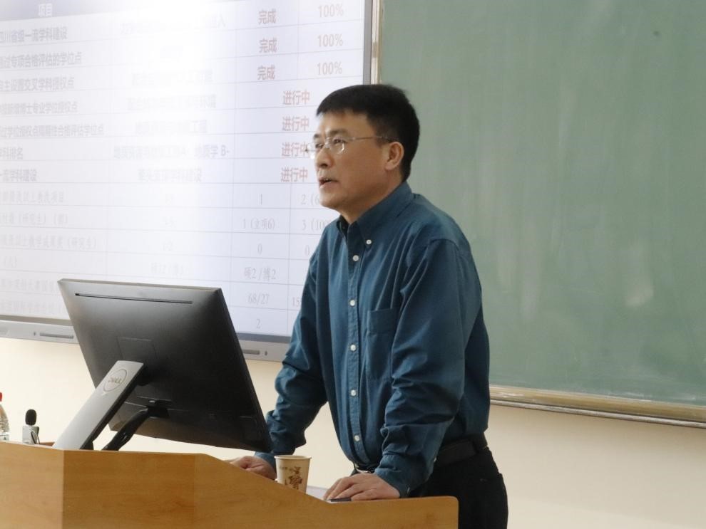 会上,地科院院长黄旭日从学科建设与研究生教育、专业建设与本科教育、科学研究、学生工作四个方面进行分析总结。他指出,学院目标完成情况良好,各项工作有序进行,自然科学基金项目稳步发展,高质量论文增长迅速,科研经费逐年增加,但纵向经费占比、教学成果有待提高。其中学生深造率、就业率以及各项大赛获奖均有进步。黄旭日院长强调2024年学院将贯彻“两条腿走路”的发展策略,通过建立课程、教研团队,提升科研、教学、教材专著成果,落实人才培养、师资培养成果,助力学生成长成才。最后,黄旭日感谢学院全体教职工的辛勤付出,并勉励大家在新阶段、新征程继续努力奋斗!