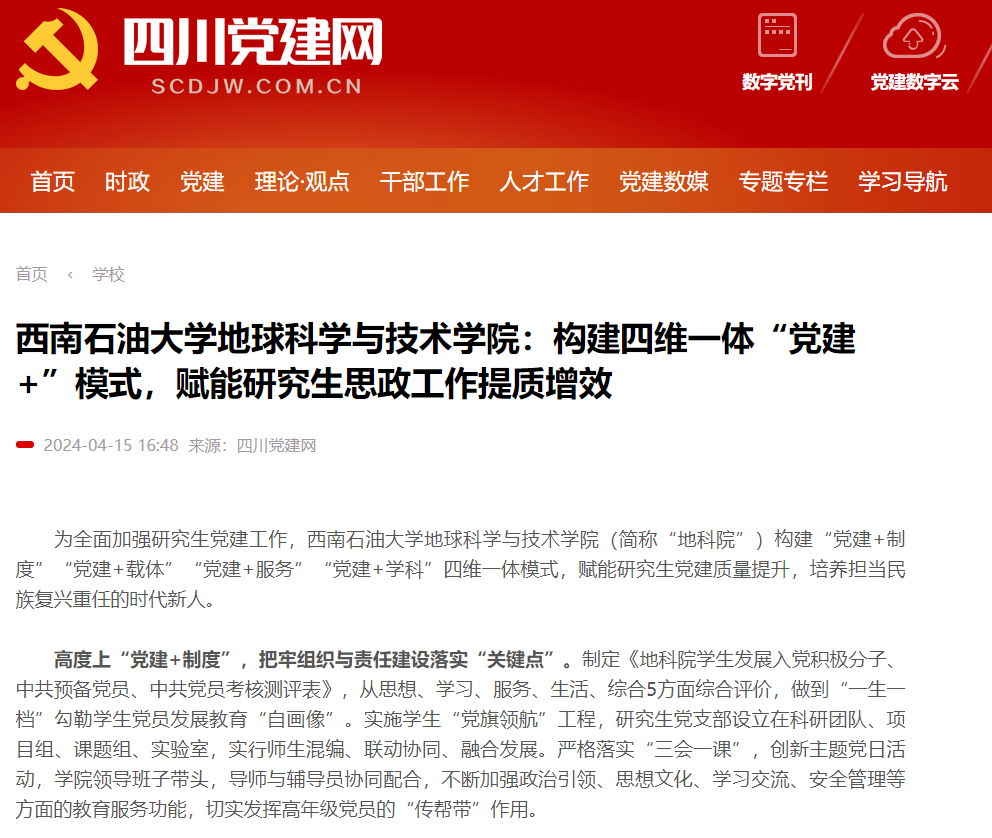 为全面加强研究生党建工作,西南石油大学地球科学与技术学院(简称“地科院”)构建“党建+制度”“党建+载体”“党建+服务”“党建+学科”四维一体模式,赋能研究生党建质量提升,培养堪当民族复兴重任的时代新人。