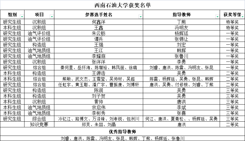 本届大赛汇聚了来自中国石油大学、中国地质大学、西北大学等全国20余所高校的400余名本科生、研究生,规模再创历史新高。经过两天的激烈角逐,我校共斩获技能竞赛各类奖项19项,其中特等奖2项,一等奖7项,二等奖3项,三等奖6项,知识竞赛二等奖1项,9位教师被评为优秀指导教师,西南石油大学获得“优秀组织奖”。除主题赛事外,我校21名研究生参与了“全国油气地质研究生学术论坛”,并获得多项“优秀论文奖”。