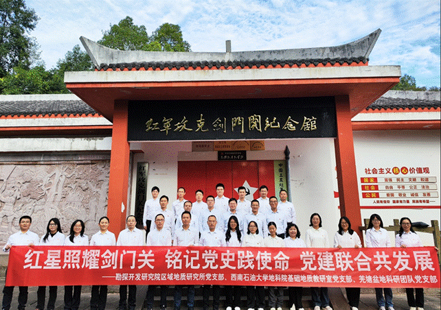 考察结束后,校企共同前往剑阁剑门关,瞻仰红军攻克剑门关纪念馆。在馆内,大家缅怀了党的光辉历程,并达成了协议,结成共建支部,决心通过党建促业务发展,共同开展油气能源地质勘探方面的基础研究、油气勘探方面的业务探讨和交流。在纪念馆的庄严氛围中,大家共同宣誓,重温了入党誓词。