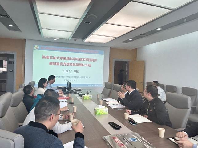 在西南石油大学地球科学与技术学院党委和中国石油西南油气田分公司勘探开发研究院党委前期党建联盟的带领下,2024年11月21日,测井教研室党支部书记陈猛、教研室主任赵军、副主任程超、教研室党员教师刘红岐、闫建平、桑琴、吴丰、赵鹏斐、贾将、杨国锋一行赴西南油气田分公司勘探开发研究院地物所开展了一次主题为“党建引领,校企合力,助力测井业务发展打开新局面”的支部联合党建活动。地物所党支部书记谢冰、副所长赖强、海相测井研究室吴煜宇、中油测井西南分公司解释评价中心王勇军等参加上述党建活动。活动由地物所党支部书记谢冰主持。