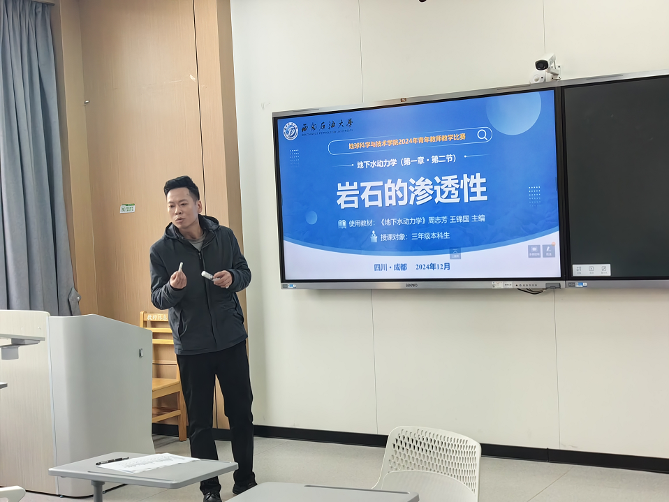 2024年12月5日,地科院教学办公室举行了青年教师课堂教学比赛暨第五届全国大学青年教师地质课程教学比赛初赛。比赛由地科院教学副院长赵虎主持,经各教研室推荐、教师报名,共有12位教师参加了本次教学比赛。学院邀请了学校教学督导组专家蔡正旗、首届全国青年教师教学竞赛一等奖获奖者刘洪斌、学院教学督导组专家刘诗琼、第七届四川省高校青年教师教学竞赛高校理科组一等奖获奖者王浩铮担任评委。