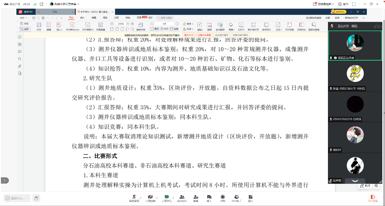 2025年1月24日下午,“第九届全国大学生测井技能大赛”西南石油大学赛区专项技能培训启动会通过视频会议方式召开,会议由测井教研室巫振观老师主持。测井教研室教师代表、报名参加大赛的研究生和本科生共计四十余人参加大会。