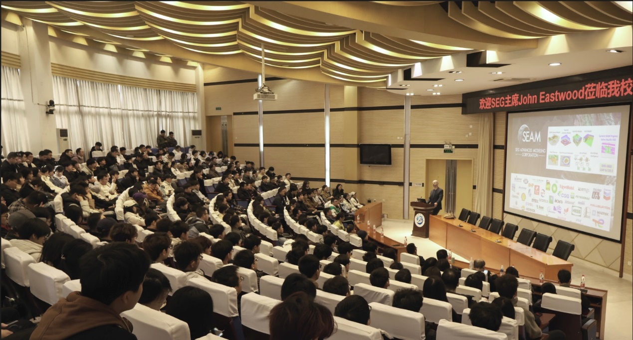 John Eastwood先生在思学楼以“地球物理学:我们共同的纽带”为主题进行学术报告。SEG协会中国区办公室总经理吴静宇,西南石油大学国际处处长戴磊,地科院院长黄旭日,副院长刘宏等出席会议。报告以“什么是SEG”为切入点,介绍了该国际性学术组织的主要工作,包括出版刊物、举办年度技术会议、全球研讨会,以及教育服务和旅行资助等项目。John先生特别指出,SEG的使命是“服务科学、服务会员、服务社会”,致力于寻找可持续、可靠且经济的能源和资源解决方案。