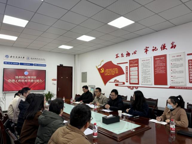 会上,双方围绕人才培养与队伍建设发展,致力于实现以共建深化创新、以党建推动发展,组建党建共同体,实现双方之间优势互补、工作互动、成果互享。与会人员分别介绍了科室业务和板块工作,双方就《地科院、图书馆党建工作结对共建协议》内容进行了深入细致交流,初步达成合作共识。