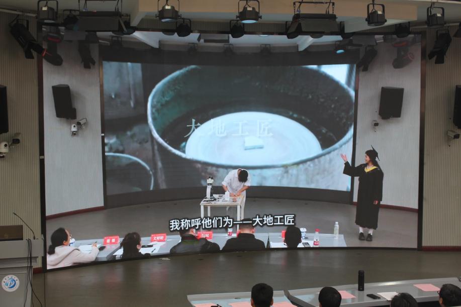大会在学生自编自导自演的情景剧《大地工匠》中拉开序幕,讲述了地科院退休教师、岩芯制片师吴建平40年如一日将将岩芯一点点打磨成“薄如蝉翼”的高水准的岩片为寻油找气打下基础。吴建平老师“执着专注、一丝不苟、精益求精、追求卓越”的精神风貌,生动展现了地科院教师“脚踏实地、爱岗敬业”的故事,深刻诠释了新时代地质人的使命担当。