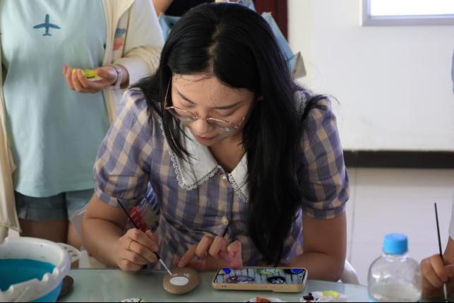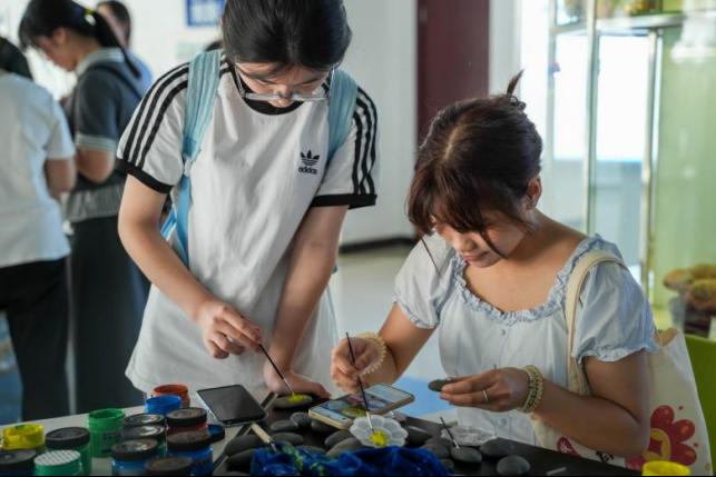 在岩石绘画环节中,三校学生以展厅所见的岩石特征为灵感,在工作人员分发的岩石材料上进行绘画创作。创作过程中,同学们跨校交流创意,分享对“自然・科学・劳动”的理解。不同学科背景的学生碰撞出独特的火花,现场洋溢着学科交融的活力。大家用画笔勾勒出对自然的热爱、对科学的敬畏以及对劳动的感悟,每一幅岩石画都成为了同学们独特创意的展现。