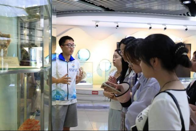 地科院辅导员刘肖老师致欢迎辞,向西南交通大学力学与航空航天学院、成都中医药大学临床医学院师生表示热烈欢迎,并阐述了活动的背景与教育初衷。随后,学院“掷地有声”地质科普宣讲团成员结合地质展厅内的标本展开讲解。从标本的地质来源、形成时期到背后的科学意义,宣讲团成员逐一解读,带领师生们揭开自然造物的神秘面纱,让大家深入了解地质科学的魅力。