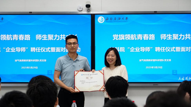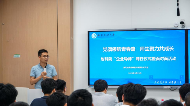2025年5月29日下午,西南石油大学地球科学与技术学院在明辨楼C108成功举办“企业导师”聘任仪式暨“党旗领航青春路师生聚力共成长”师生交流会。本次活动特邀西南石油大学矿产普查与勘探2010届硕士研究生校友,川庆地研院非常规油气研究中心副主吴家杰做报告,地科院党委副书记、纪委书记张勇,油气地质教研室唐洪、杨辉廷、丁熊,辅导员刘肖以及资源勘查工程2022级创新班和产业班的全体同学参与。活动由油气地质教研室科研团队党支部书记丁熊主持。